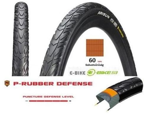 Arisun Metro Runner 28 x 1,5 (40-622) városi külső gumi (köpeny), defektvédett (5 mm), reflexcsíkos, 60TPI, E25, 930g Könnyen gördülő külső gumi aszfaltra Defektvédelem: PD Puncture Defense Level 5 Szövetsűrűség: 60 TPI Súly: 850 g E-Bike is használható 25 km/óra Amennyiben gondot okoz a megfelelő kerékméret és/vagy defektvédelem kiválasztása, görgess lejjebb, ahol ré