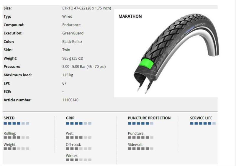 Méret: 28*2.0 (622-40). Súly: 660 g. Nyomás: 2.5-4.5 Bar (350-65 psi). Maximális terhelhetőség: 125 kg. Keverék: Addix. Defektvédelem: Schwalbe V-Guard A legmodernebb túraabroncs. Hihetetlenül többcélú futófelület a legújabb gumiabroncs-technológiával a tökéletes menetteljesítmény és a fokozott defektvédelem érdekében. Az új, nagy teljesítményű ADDIX keverék jobb tap