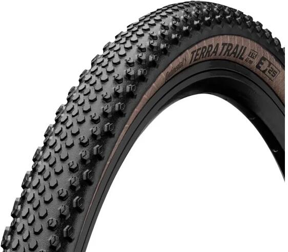 Continental Terra Trail 28x1,5 (40-622) gravel külső gumi (köpeny), kevlárperemes, defektvédett (Shieldwall), TL-Ready, E25, barna oldalfalú, 445gGravelre ajánlott külső gumi, elegáns barna oldalfallal. Kiválóan használható kemény, döngölt terepen vagy lazább földutakon is. Kalandozásra tervezve. Alacsony gördülési ellenállás jellemzi, de emellett kiválóan kapaszkodik a