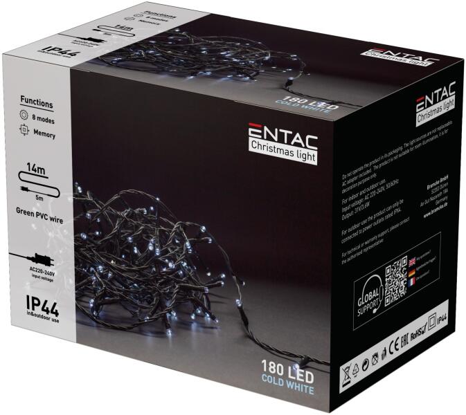 Entac Karácsonyi IP44 180 LED Füzér CW 14m Öltöztesse karácsonyi hangulatba teraszát, erkélyét vagy lakását az Entac Ledes karácsonyfa füzéreivel. A klasszikus karácsonyi díszítés elengedhetetlen darabja. A 8 világítási mód vidám fényjátékkal dobja fel a termékeket. Memória funkciójának köszönhetően a termék megjegyzi a legutolsó beállítási adatokat. A Led fü