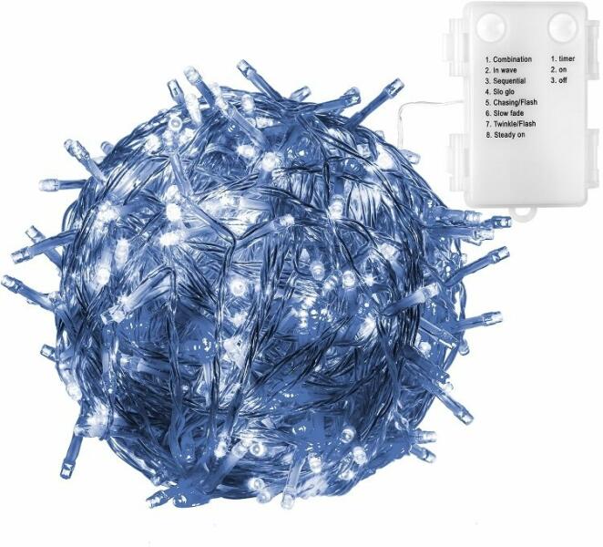 Kültéri LED elemes fényfüzér - 20m - 200 LED, hideg fehér A kültéri LED elemes fényfüzér 20m ideális kellék karácsonyi világításhoz, kerti dekorációhoz, karácsonyfa megvilágításához vagy erkélyvilágításhoz. Nincs szükség hálózatra, bárhová könnyedén telepíthető. Tölthető elemekkel hosszabb ideig élvezhető a füzér fénye és környezettudatosabb megoldás