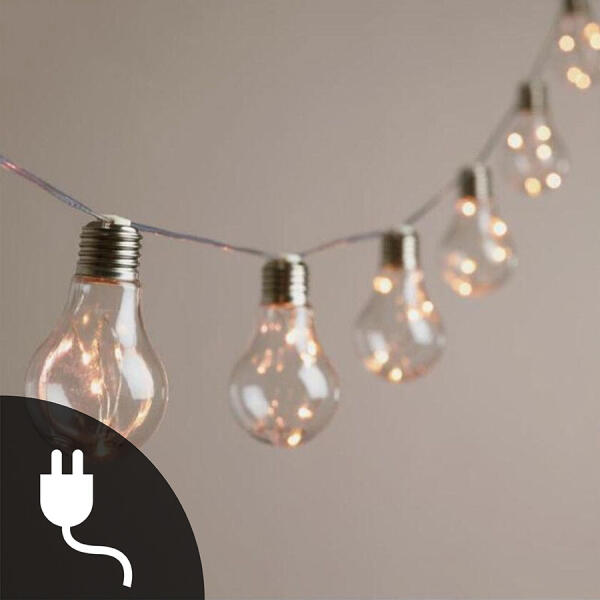 10 LED-es lámpafüzér, teraszvilágítás, időjárásálló, E27 foglalattal, IP44, 10 m - meleg fehér A füzér gyönyörű, stílusos, meleg színben izzó izzókkal van felszerelve , amelyek lágy, kellemes fénnyel világítják meg a környéket. Az izzók és a vezetékek nedvességállóak , így a füzér kültéren és beltéren egyaránt használható, anélkül, hogy aggódnia kelle