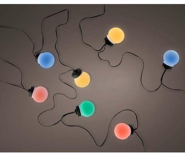 Kültéri LED party fényfüzér színes gömbökkel - 9,5 m - 20 izzó A kültéri LED party fényfüzér ideális kellék terasz világításhoz, kerti dekorációhoz vagy erkélyvilágításhoz. Kültéri, beltéri használatra (IP 44 védelem) Sodródj a buli hangulatába ezzel a színes kültéri LED gömb fényfüzérrel! A 9,5 méter hosszú füzér 20 színes izzóval van felszerelve, így