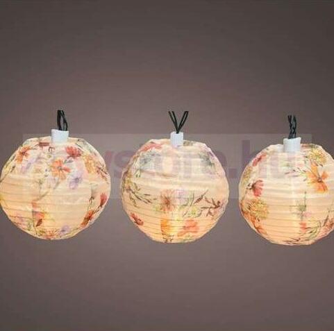 Napelemes lampionfüzér színes lampionokkal Napelemes lampionfüzér színes mintás lampionokkal, 10 db fehér LED izzóval. Ki - bekapcsolható. Használható kültéren és beltéren (1 db AA ceruzaelemmel). TARTÓS A napelemes lampion füzér anyaga nylon, amely 100%-ban vízálló anyag! Nagyon tartós és sokkal erősebb, mint a papír. SOLAR VILÁGÍTÁS A napelemes lampionfüzér színes