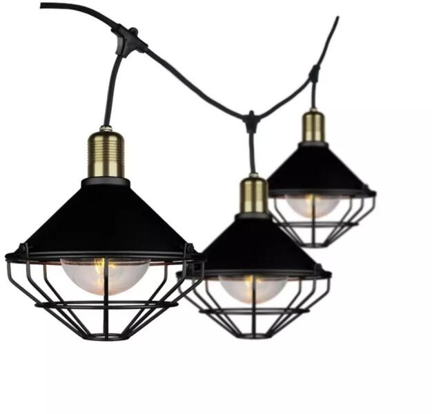 3 méteres LED fényfüzér, 6db, E27 foglalatú, vas búrás lámpával.
