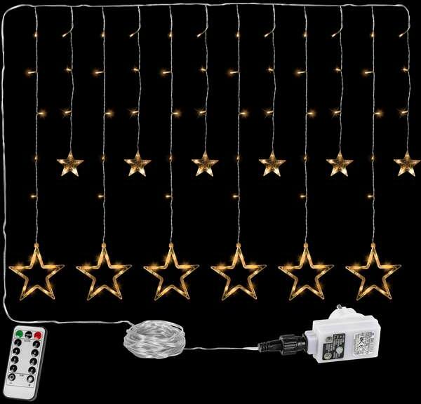LED csillag fényfüggöny, meleg fehér 2x1m A csillag fényfüggöny meleg fehér, 150 energiatakarékos LED izzóból áll, kül- és beltéren egyaránt használható , közvetlen 230 V-os csatlakozóval. Lenyűgöző hangulatot teremt a teraszra, a kertbe vagy a ház falára helyezve. VILÁGÍTÁSI MÓDOK 8 világító mód: 1. kombinált, 2. fényhullám, 3. egymást követő, 4. izzó, 5. v