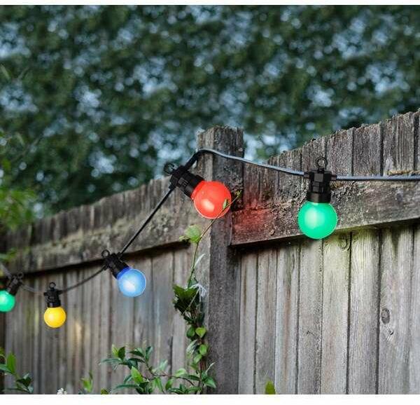 Színes kültéri fényfüzér - 9,5 m - 20 izzó - színes búrákkal, 8 funkció A színes kültéri fényfüzér ideális kellék terasz világításhoz, kerti dekorációhoz vagy erkélyvilágításhoz. Kültéri, beltéri használatra (IP 44 védelem) A termék sorolható a kiegészítő szett segítségével. Maximum 5 szett kapcsolható össze. A LED-es fényfüzér a belső transzformátor