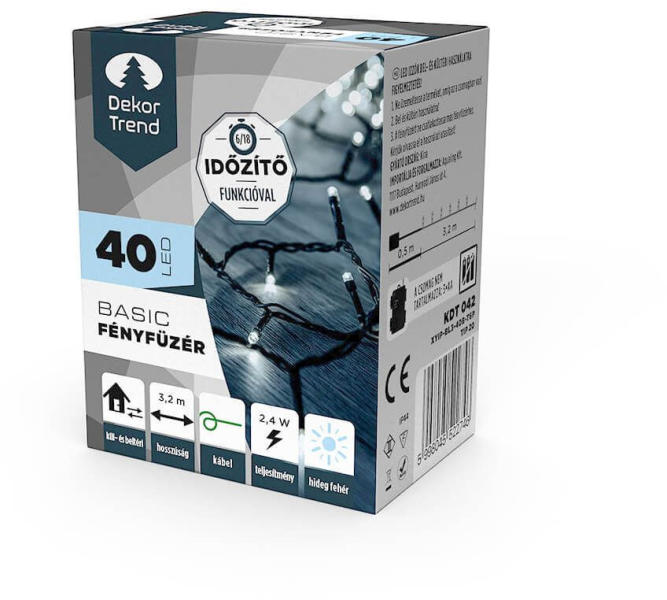 Dekortrend Basic 40 LED fényfüzér timer funkcióval, elemes, hideg fehér A legegyszerűbb fényfüzér kedvező áron. Elemes, ezért bárhol, konnektor nélkül könnyedén dekorálható vele minifenyő, ünnepi asztal, polc, ajtó vagy ablak. Sőt, akár magaddal viheted a karácsonyi buliba, baráti beszélgetésekre hangulatfénynek. IP44-es szigetelésű elemtartója és kábele miatt egy