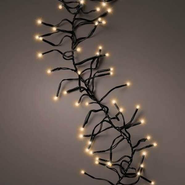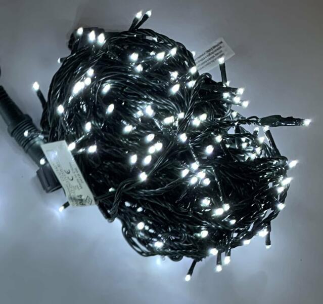 LED kültéri karácsonyi lánc. LED-ek száma: 100. Fény színe: meleg fehér. Időzítő és fényerőszabályozó funkciók. Az időzítő 6 óra után kikapcsolja a fényt, és 18 óra után automatikusan visszakapcsolja. Izzó távolsága: 10 cm. A világító kábel hossza: 10 m. A tápkábel hossza: 5 m. Kábel színe: zöld. Védelmi osztály: IP44 (beltéri és kültéri használat).