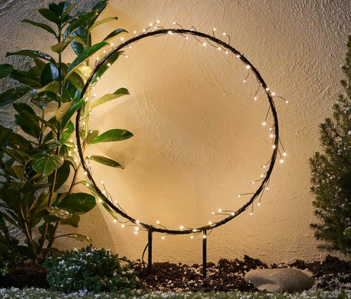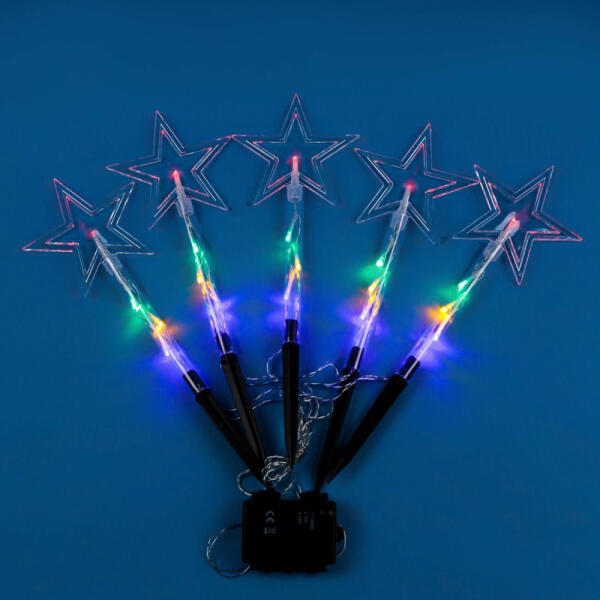 Karácsonyi kivilágítás a kertben. A LED sor 15 db földbe szúrható csillagot tartalmaz, darabonként 3 db színes LED világítja meg. Csillagok között 35 cm távolság van. Idózítővel ellátott, így 6 óra működés után kikapcsol, majd 18 óra múlva visszakapcsol. 3 db AA elemmel működik, melyek nem tartozékok. Vízállóság: IP44 Csomagolás mérete: 12.5x6x38 cm Magasság: 2