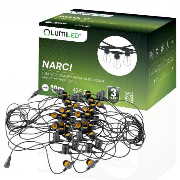 Kültéri fényfüzér villanykörte égősor - 9,5 m - 20 izzó A kültéri LED villanykörte égősor ideális kellék terasz, kerti összejövetelek vagy erkély megvilágításhoz. Kültéri, beltéri használatra (IP 44 védelem) A LED-es villanykörte fényfüzér hálózati adapter segítségével működik, sorolható. A LED-es villanykörte égősor a belső transzformátor elektromos alj