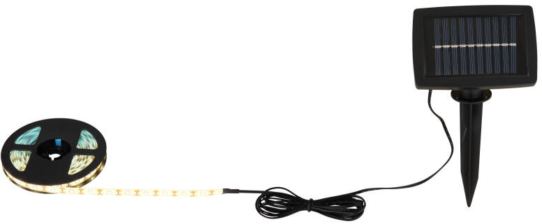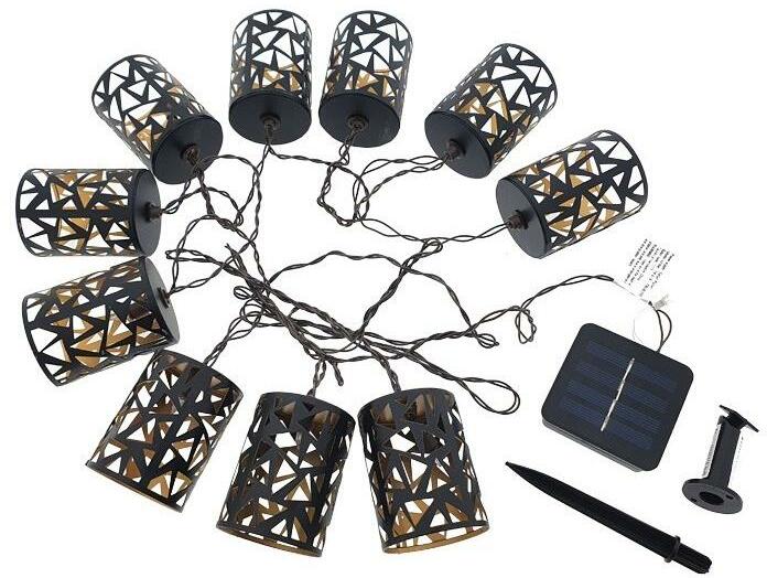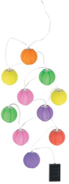 LED-es napelemes lánc modern dizájnnal. Az alacsony fényintenzitás miatt főként dekorációs lámpaként használják. Alkalmas kertek, utak, pavilonok és teraszok díszítésére. Lámpák száma: 10 (E12, G40). A megvilágított rész hossza: 1,82 m. Teljes hossz: 3,65 m. Világítás színe: meleg fehér. Napelem: 2V 100 mA. Tápegység: Ni-MH AA, 1,2 V 600 mAh. Világítási idő: 8 ór