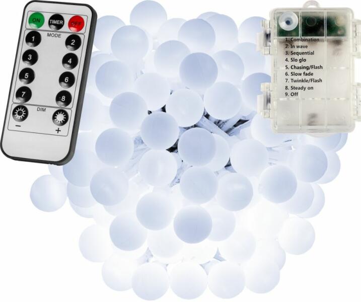 LED-es kültéri karácsonyi lánc, amely többszínű (RGB) és fehér fény között válthat. LED-ek száma: 200. LED-gömb mérete: 1,8 cm. Az egész lánc fehér vagy RGB fényben világíthat. 8 világítási mód (fehér fény, többszínű fény, villogás, keveredő fény, tompítás stb. ). Memória funkció - bekapcsoláskor az utoljára használt fénymód aktiválódik. Időzítő 6