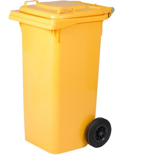 Háztartási szemetes kuka sárga 120 L (11909) A sárga színű háztartási szemetes kuka űrtartalma 120 liter. Magassága 900 mm, szélessége 475 mm, hossza 550 mm. CE jelölést előíró jogszabályoknak megfelel. A háztartási szemetes kuka egyszerű mozgatását elősegíti a 2 darab kerék. Gépi ürítésre alkalmas. Terhelhetősége: 60 kg. A háztartási kuka forró folyadék vagy ha