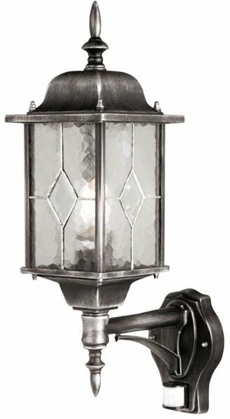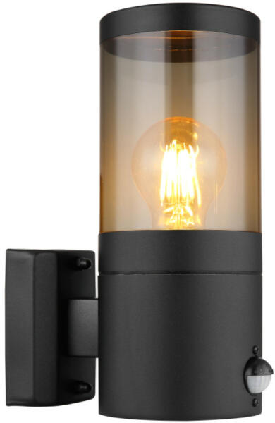Matt fekete színre festett rozsdamentes acél mozgás érzékelős fali lámpa füstszínű műanyag búrával, E27-es foglalattal, IP44-es védelemmel.