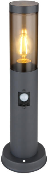 Antracit színre festett rozsdamentes acél kültéri mozgás érzékelős álló lámpa füstös műanyag búrával, E27-es foglalattal, IP44-es védelemmel.