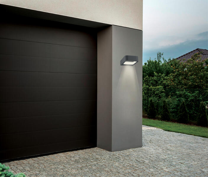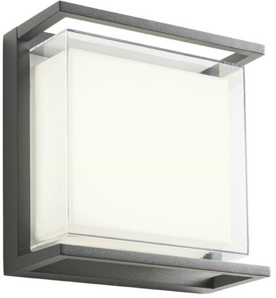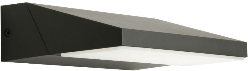 Modern stílusú, sötétszürke színű, szögletes formájú kültéri fali lámpa, amely 15 fokos szögben világít. Meleg fehér fényű, beépített LED fényforrást tartalmaz, mely nem cserélhető. A búra anyaga alumínium. Ip54-es védelemmel rendelkezik, amely véd a fröccsenő víz ellen, illetve nem hatolhat be olyan mennyiségű por, amely zavarná a berendezés működését. Spec
