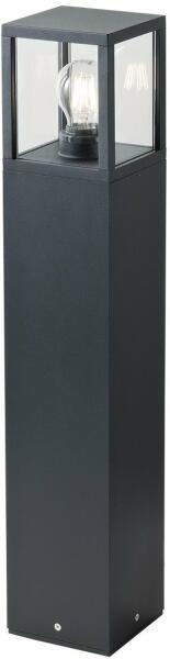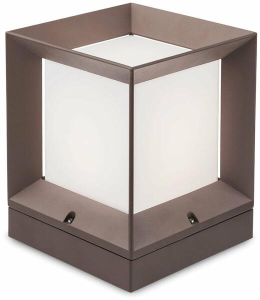 Modern stílusú kültéri álló lámpa, sötét barnára festett alumínium vázzal és opálos, polikarbonát betétes búrával, IP54-es védelemmel.