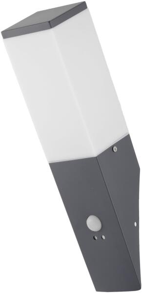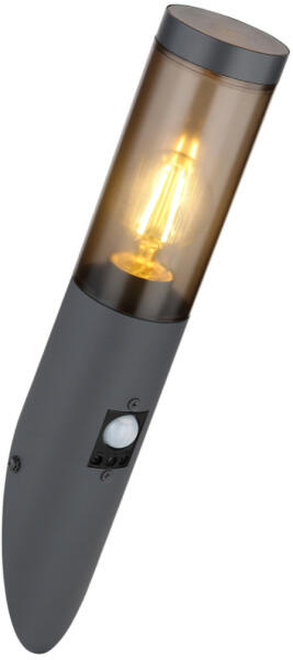 Antracit színre festett rozsdamentes acél kültéri mozgás érzékelős fali lámpa füstös műanyag búrával, E27-es foglalattal, IP44-es védelemmel.