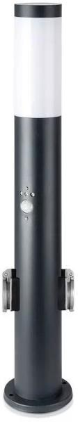 V-TAC fekete színű kültéri állólámpa E27-es foglalattal, 2 db konnektorral, mozgásérzékelővel Fekete színűre festett rozsdamentes acél vázas, 60 cm magas állólámpa, melyben egy maximum 60 Watt teljesítményű E27-es foglalatú fényforrás helyezhető. Előnye ezáltal, hogy ha meghibásodik a fényforrás, egyszerűen tudjuk cserélni azt. Kültéri állólámpa 2 db hálózati