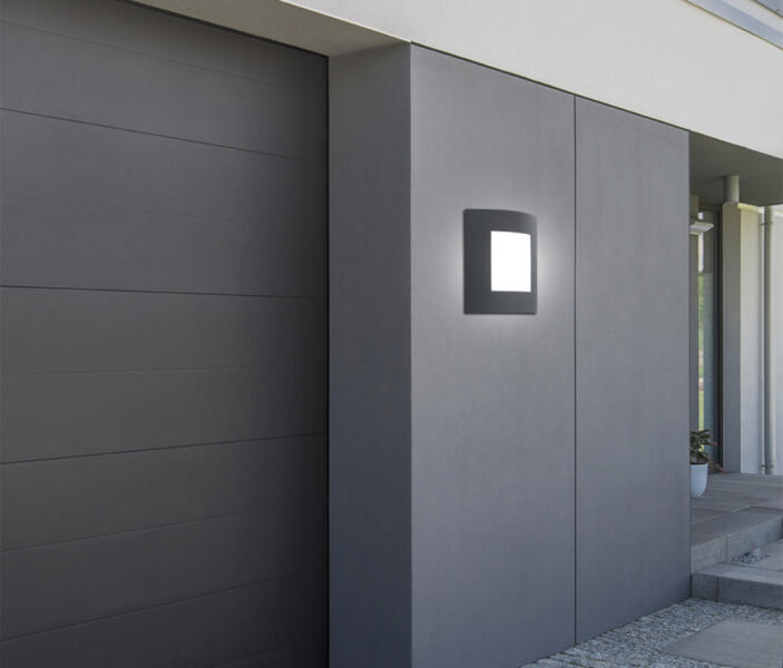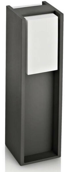 Modern, kültéri fali lámpa. A lámpa anyaga alumínium, formája szögletes, színe sötétszürke. A búra középső része fehér akril. A csomagolás a fényforrást nem tartalmazza. IP44-es védelemmel rendelkezik, amely fröccsenő víz és 1 mm-nél nagyobb szilárd testek elleni védelmet jelent. A terméket nem gyári csomagolásban szállítjuk. Az akció a készlet erejéig érvénye