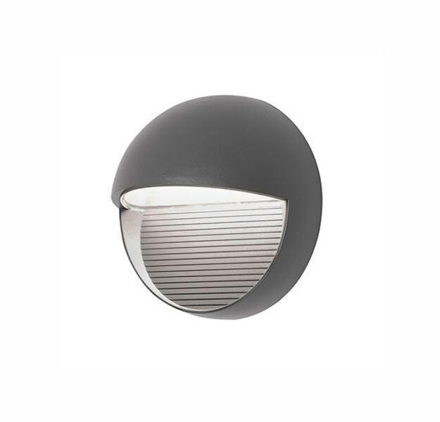 Modern, kültéri, lépcső megvilágító lámpa. Anyaga alumínium, formája kerek, színe sötétszürke. A lámpa 31 fokos szögben világít, meleg fehér fényű, beépített LED fényforrást tartalmaz, mely nem cserélhető. Ip54-es védelemmel rendelkezik, amely véd a fröccsenő víz ellen, illetve nem hatolhat be olyan mennyiségű por, amely zavarná a berendezés működését. Speci