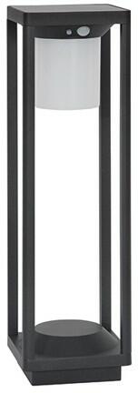 Antracit színű kültéri állólámpa beépített napelemmel és mozgásérzékelő szenzorral. 3000Kelvines, azaz meleg fehér fényű beépített LED fényforrást tartalmaz, mely nem cserélhető. Színvisszaadási aránya 80%, világítási szöge 125fok. IP65-ös védelemmel rendelkezik, azaz kisnyomású vízsugár ellen védett. A lámpa fényereje szabályozható. A mozgásérzékelő sz
