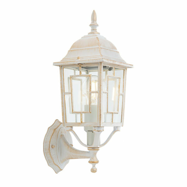Matt fehér alapon arany patinás alumínium kültéri lámpa átlátszó üveg búrával, IP44-es védelemmel.