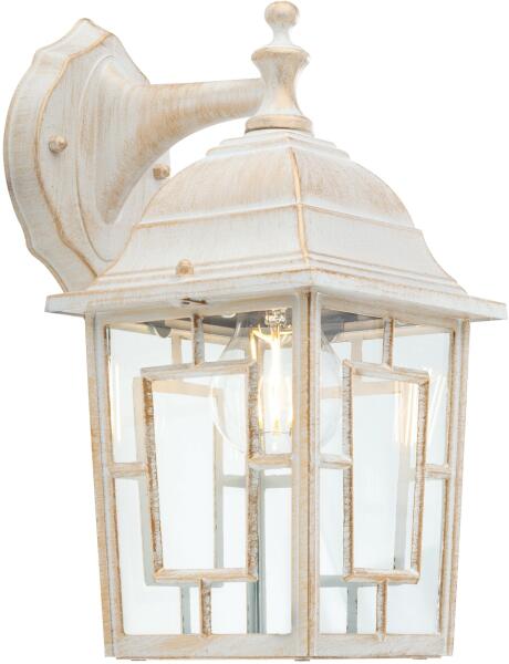 Matt fehér alapon arany patinás alumínium kültéri lámpa átlátszó üveg búrával, IP44-es védelemmel.