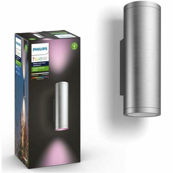 Philips Hue Appear fali lámpa 2db inox Korlátlan lehetőségek a különleges élményekért Integrált LED Fehér és színes fény Hálózati tápellátású Intelligens szabályozás Hue Bridge-dzsel* Időjárásálló (IP44) Ezt a Philips Hue kültéri lámpatestet kifejezetten kültéri használatra tervezték, és szigorú teszteknek vetették alá a megfelelő üzembiztonság érdekében.