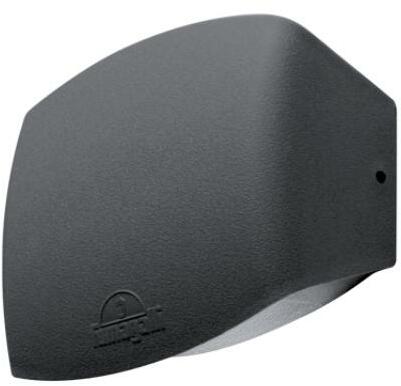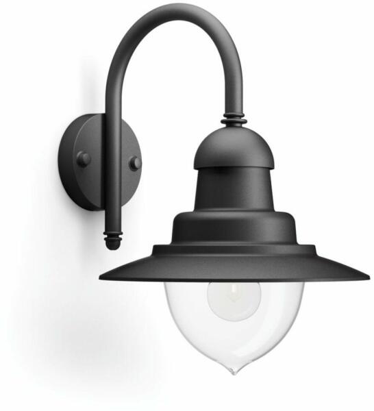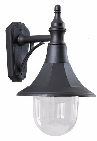"Modern stílusú, grafit színű, kültéri fali lámpa. A lámpatest fém, az alsó búra üveg. Az oldalfali lámpa lefelé világít, faltól való elállása 17 cm. Védett apró méretű szilárd tárgyak ellen (>1 mm) és védett fröccsenő víz ellen minden irányból, a lámpa IP 44-es védelemmel rendelkezik. A fényforrást a csomagolás nem tartalmazza. Milyen fényforrást ajánlu