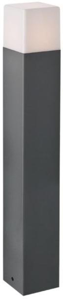 Modern stílusú, kültéri álló lámpa, sötét szürkére festett alumínium szerkezettel, opálos polikarbonát betétes búrával, IP44-es védelemmel.