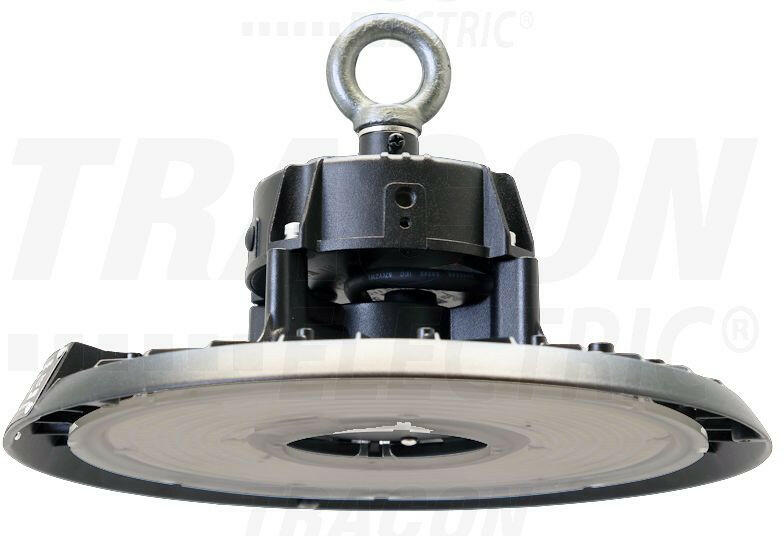 Tracon LHBA150W LED csarnokvilágító, kültéri, UFO forma 230 VAC, 150 W, 30000 lm, 4000K, 50000 h, IP65, 1-10V, EEI=B Szerelési mód: lengő Fényforrás: beépített LED-es Fényforrással: Igen Ház anyaga: alumínium Feszültség fajtája: AC Névleges feszültség: 220 - 240 V Fényeloszlás: szimmetrikus Állandóra beépített fényforrás energia-hatékonysági osztálya: egyéb Névle