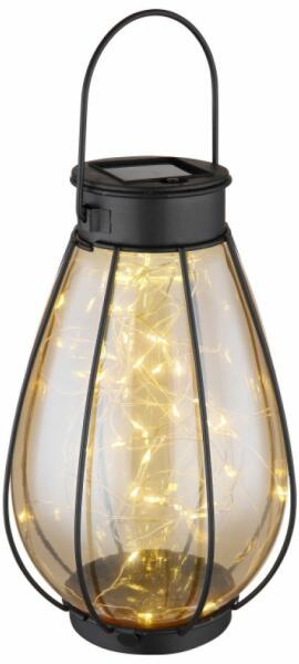 Solar lámpa, könnyűfém fekete matt, műanyag fekete matt, borostyánsárga színű üveggel, nyomáskapcsoló, akkumulátorral: AAA 400mAh 1,2V, IP44, ø: 120mm, M: 300mm, tartozék: 40x LED 0,06W 3V, 3000K