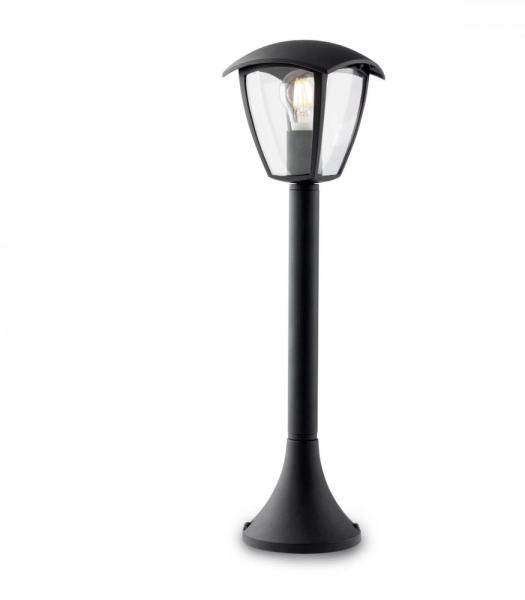 Kültéri álló lámpa, fekete színű alumínium vázzal és átlátszó műanyag búrával, IP 44-es védelemmel.