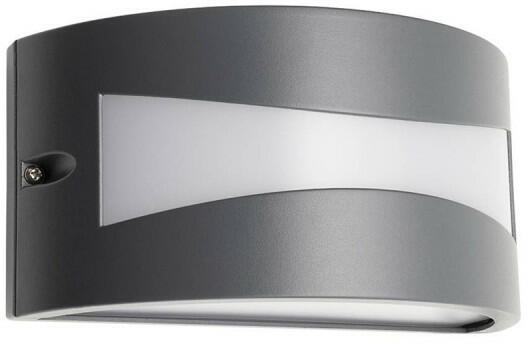 Sötét szürke színre festett alumínium vázas kültéri fali lámpa opálos polikarbonát búrával, beépített LED fényforrással, IP54-es védelemmel.