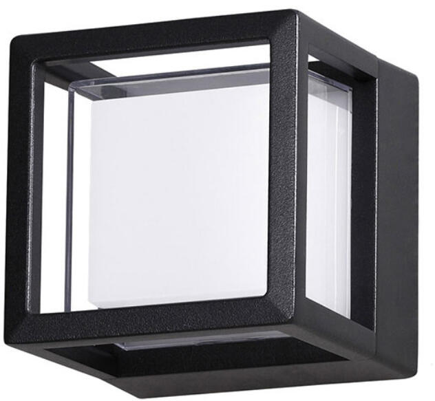 Modern stílusú, fekete, szögletes kültéri fali lámpa akril búrával. Meleg fehér fényű, beépített LED fényforrást tartalmaz, mely nem cserélhető. IP54-es védelemmel rendelkezik, ami fröccsenő víz és por elleni védelmet jelent. Színvisszaadási indexe 80. Specifikációk:Gyártó: Nova Luce Cikkszám:: NL-9207616 Foglalat: 1 x Beépített LED Méret (ma x sz x mé): 110 x 110