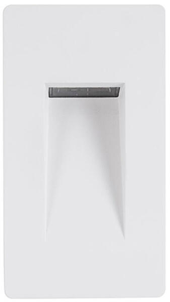 Alumíniumból készült, matt fehér színű kültéri oldalfalba süllyeszthető lámpa. IP54-ös védelemmel rendelkezik, azaz fröccsenő víz ellen védet minden irányból. 3000Kelvines, azaz meleg fehér fényű beépített LED fényforrást tartalmaz, mely nem cserélhető. Világítási szöge 120fok. Ideális választás lépcsőmegvilágításnak. Kivágási mérete 132x74x50mm. Specifi