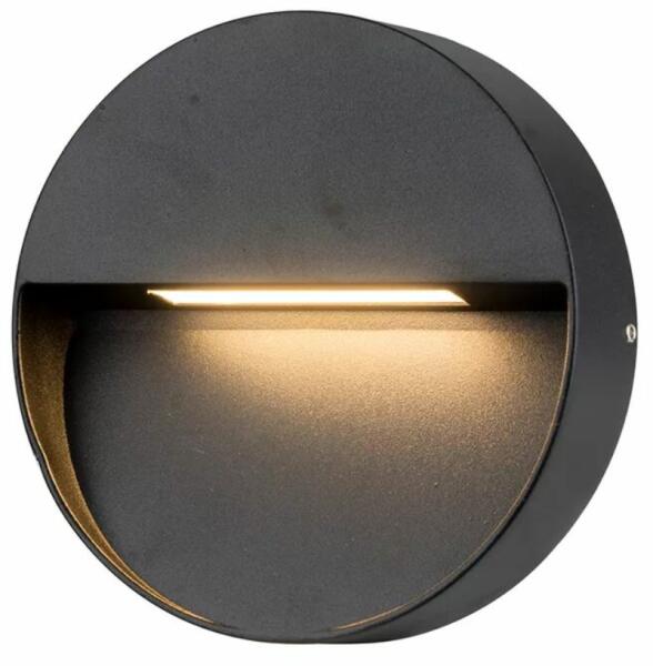 Sötétszürke, kerek kültéri fali lámpa. Kiváló választás lehet akár kültéri lépcsők hangulatos megvilágítására is. IP54-es védelmének köszönhetően védve van a fröccsenő vízzel, illetve a porral szemben. Beépített LED fényforrást tartalmaz, mely nem cserélhető. Specifikációk:Gyártó: AZzardo Cikkszám:: AZ-4365 Foglalat: 1 x Beépített LED Méret (ma x sz x mé)