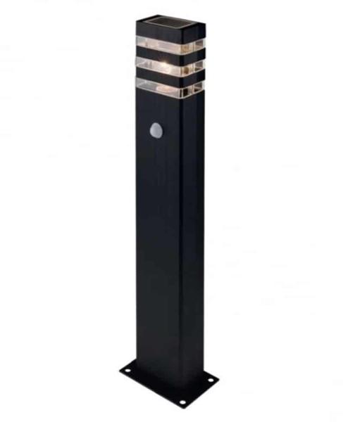 "Modern kültéri állólámpa, melynek anyaga alumínium, színe fekete. A búra szintetikus anyagból készül. Magassága fix nem állítható. Mozgásérzékelővel rendelkezik amelynek hatótávolsága 6 m. IP54-es védelemmel rendelkezik, amely véd a fröccsenő víz ellen, illetve nem hatolhat be olyan mennyiségű por, amely zavarná a berendezés működését. Milyen a lámpa fénye?A R