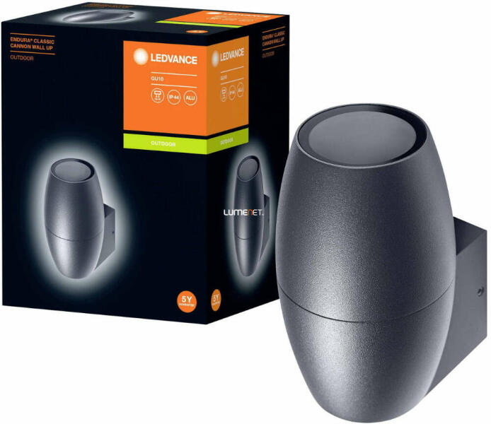Ledvance Endura Cannon Up kültéri fali lámpa, GU10, 35W, IP44, alumínium, sötétszürke Alkalmazási területek Épületek homlokzatai; bejárati világítás; Teraszok, erkélyek; Útjelző lámpák; Garázsbejáratok; ELŐNYÖK Nagy rugalmasság a fényforrás kiválasztásában a GU10 alapnak köszönhetően; Egyszerű és gyors telepítés; Jellemzők Közvetett világítás; Ház anyaga: