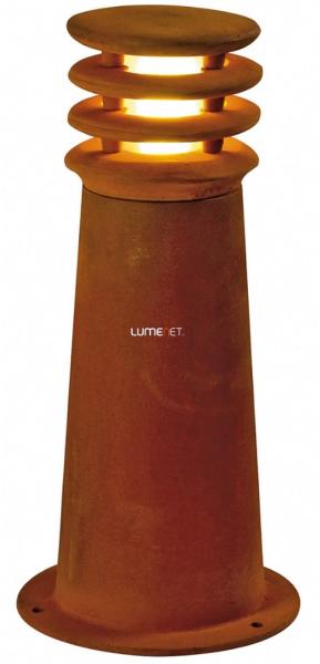 RUSTY 40 corten acél IP55 E27 kültéri allólámpa angol nyelvű gyátrói leírása: The direct radiating floor stands of the RUSTY series convince by their exceptional rust look. This is achieved by a special chemical treatment of the FeCSi steel used, which produces a controlled rust layer on the surface, which protects the actual material from further corrosion. This makes the luminaires uni