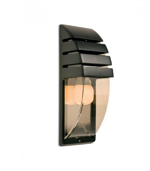 Matt fekete színű, alumíniumöntvény kültéri fali lámpa, füstös polikarbonát búrával és IP44-es védelemmel.