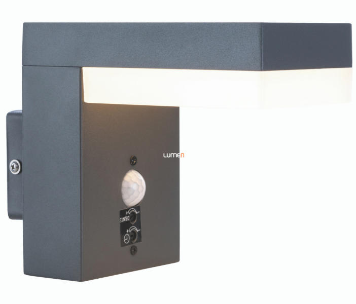 Kültéri falikar alumínium antracit, műanyag opál búrával. IP44, Mozgásérzékelő: 90°, 2-8 Méter, H: max. 2,5m, BxH:95x145, AL:193, inkl. 1xLED 9,5W 230V, 800lm, 3000K Energiacímke: A++-E Használt feszültség: 230V Fényforrás teljesítménye (Watt): 9,5W Fényforrás foglalata: LED Foglalatok száma: 1 Magasság: 145mm Szélesség: 95mm Fényerősség: 800lm Színhőmérséklet: 30