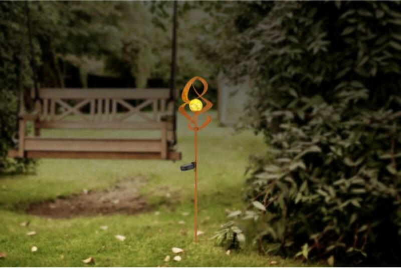 Solar leszúrható lámpa, fém rozsdabarna színű, üveg borostyán színű gömbbel, akkumulátorral: AAA 200mAh 1.2V, IP44, ø: 145mm, M: 900mm, tartozék: LED 0.06W 3V, 3000K
