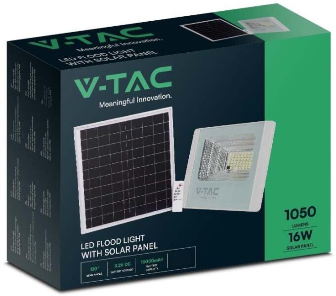 V-tac napelemes LED reflektor (1050 lumen/120°) - Természetes fehér, távirányítós A LED reflektor színhőmérséklete természetes fehér, fényereje 1050 lumen. A reflektorhoz a gyártó egy napelemet mellékelt, így a lámpát nem kell rákötnünk a 230 Voltra. A napelem felszerelhető bármilyen oszlopra vagy falra. A teljes feltöltés után 8 órás folyamatos világításra is kép