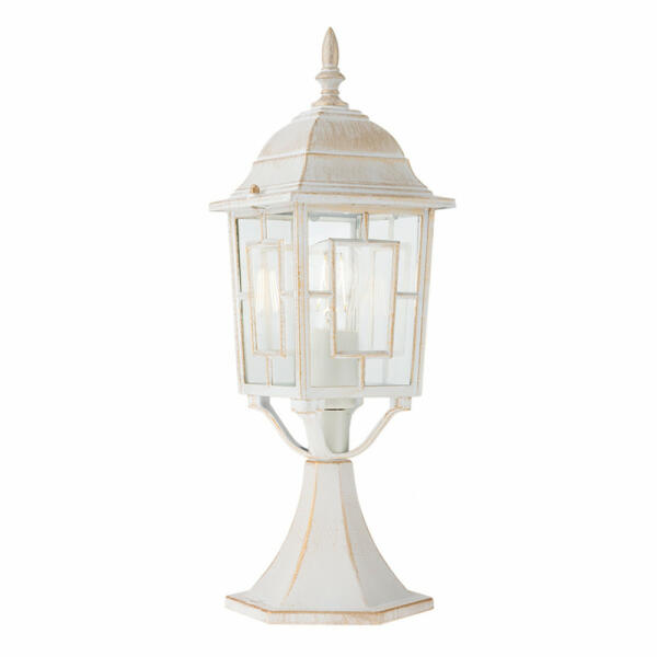Matt fehér alapon arany patinás alumínium kültéri lámpa átlátszó üveg búrával, IP44-es védelemmel.