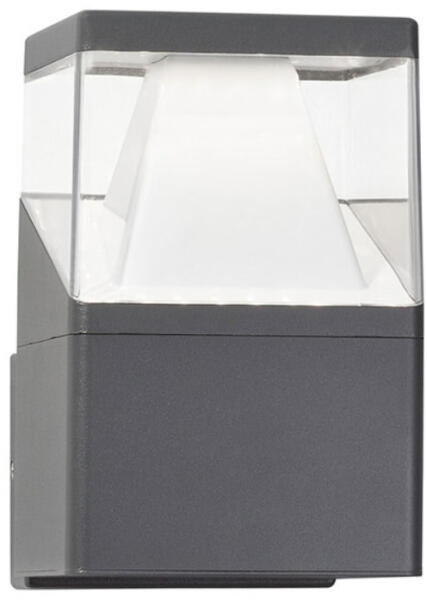 Modern stílusú, sötétszürke fali lámpa átlátszó akril búrával. Meleg fehér fényű, beépített LED fényforrást tartalmaz, mely nem cserélhető. IP54-es védelemmel rendelkezik, ami fröccsenő víz és por elleni védelmet jelent. Színvisszaadási indexe 80, világítási szöge 45 fok. Specifikációk:Gyártó: Nova Luce Cikkszám:: NL-813101 Foglalat: 1 x Beépített LED Méret