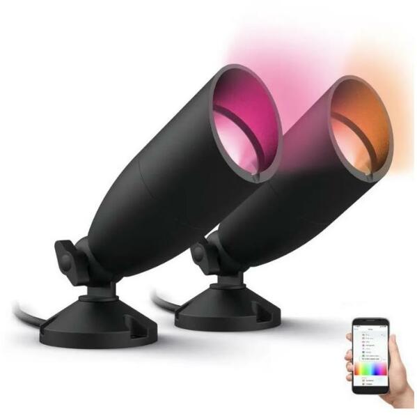 2x intelligens kültéri spotlámpából álló készlet. Állítható színhőmérséklet 2700K és 5000K között. Akár 16 millió szín közül választhat - RGB + RGBW funkció. Az RGBW egy kiegészítő funkció, amely lehetővé teszi a fehér szín beállítását a hideg és a meleg fényszín között. Vezérelhető a WiZ App segítségével, amely ingyenesen letölthető okostelefonra v