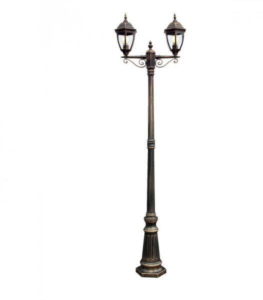 Klasszikus stílusú, kültéri kandeláber, patinás arany színű alumínium vázzal, átlátszó üveg búrával, IP44-es védelemmel.